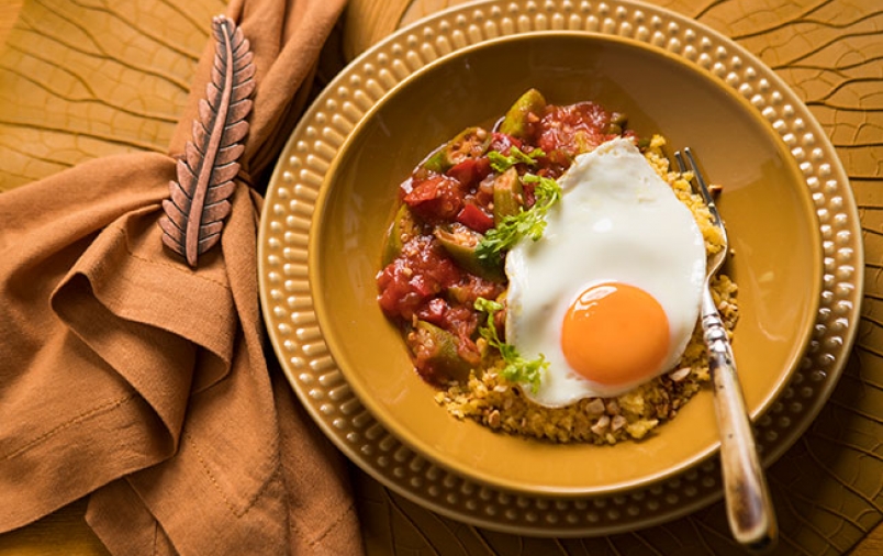 Ensopado de quiabo com cuscuz de milho e ovo frito
