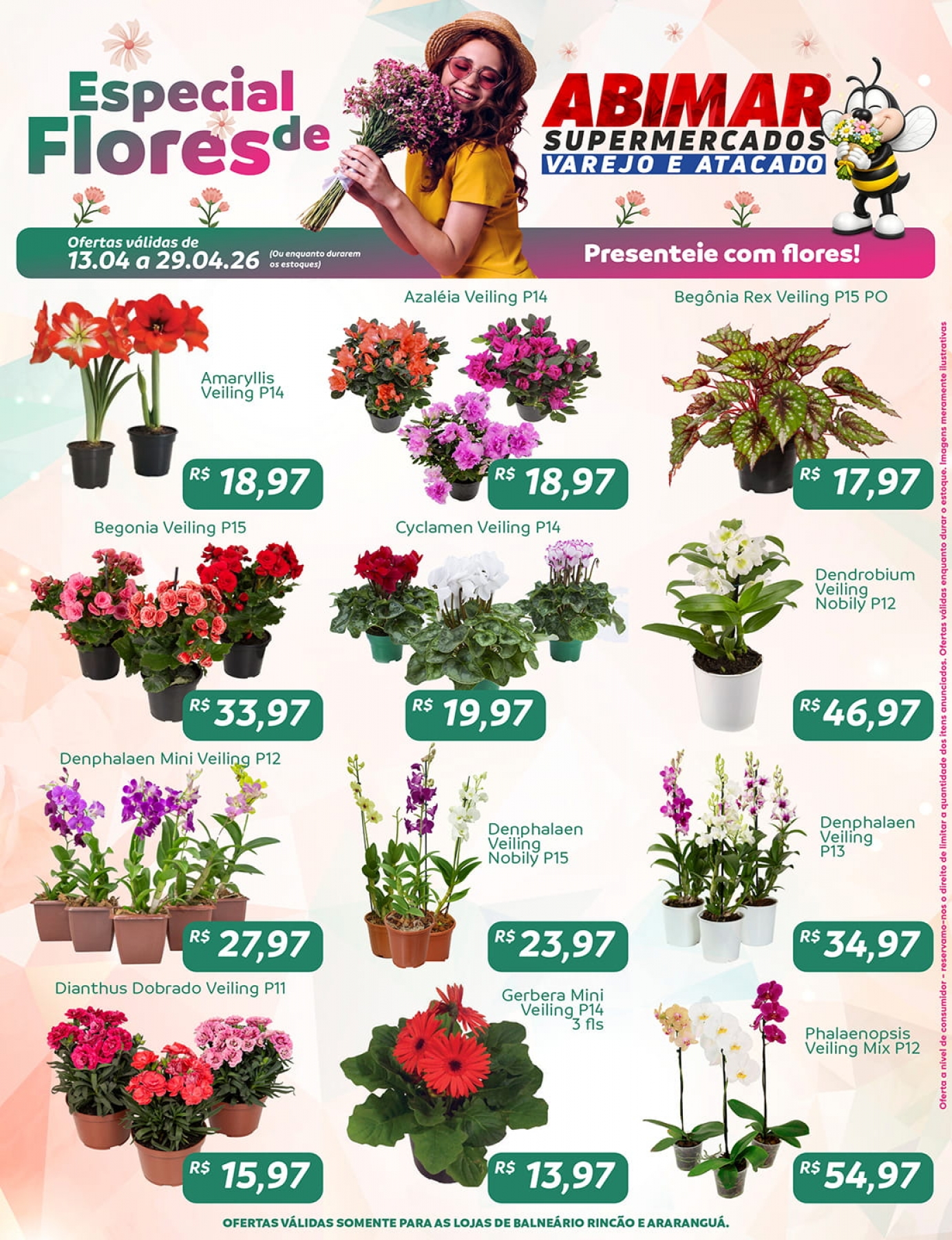 Especial Flores no Abimar Supermercados. Presenteie com flores! Ofertas válidas de 13/04 a 29/04, nas lojas de Balneário Rincão e Araranguá.